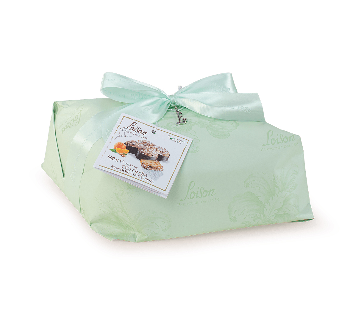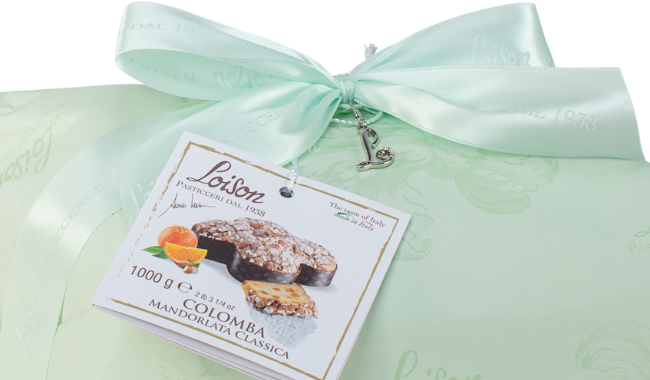 Italienischer Osterkuchen der Meisterbäckerei Loison. In dekorativer pastellgrüner Geschenkverpackung und pastellgrüner Schleife.