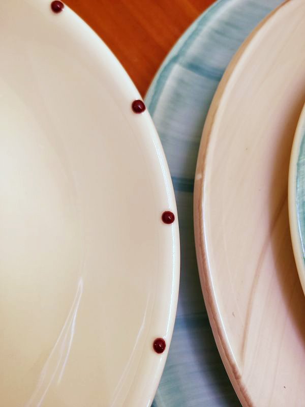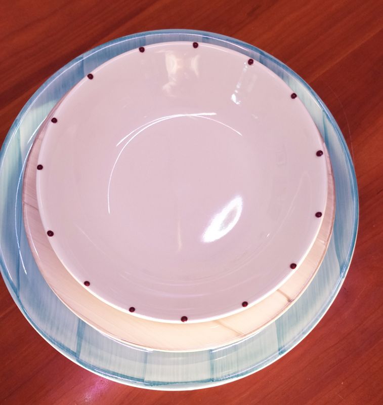 Tiefer Teller: Ø 220 x 60 mm, weiß mit farbigen Punkten am Tellerrand: BORDEAUX